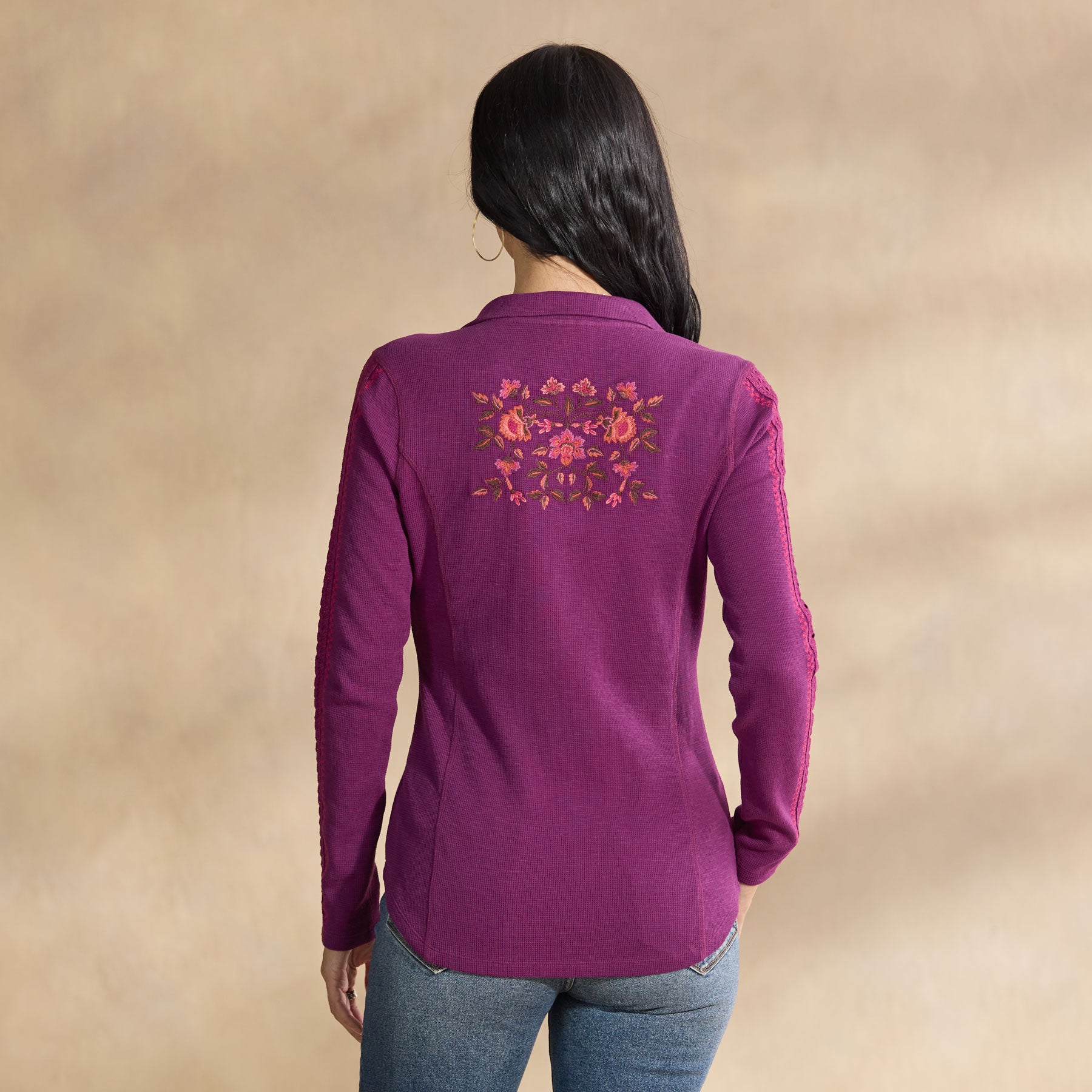 So flattering. our mock neck henley is blooming with stunning. multi colored floral embroidery. feminine lace insets at the sleeves and metal snaps at the placket. Princess seams. Cotton. Machine wash. Imported. Exclusive. Sizes XS (0?C2). S (4?C6). M (8?C10). L (12?C14). XL (16?C18). XXL (20?C22). Approx. 25l.