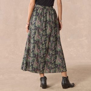 So flowing and breathable. our printed gauze silhouette skirt with an asymmetrical front ruffle detail and novelty slit at the princess seam is as comfortable as it is beautiful. Side zipper. printed self-lining. Cotton. Machine wash. Imported. Exclusive. Sizes XXS (00). XS (0?C2). S (4?C6). M (8?C10). L (12?C14). XL (16?C18). Approx. 35l.