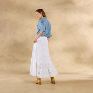 Our easygoing Ensenada Skirt features breezy tiered eyelet in a versatile midi length with a forgiving elastic waistband and a charming scalloped hem. Cotton. Machine wash. Imported. Exclusive. Sizes XS (0-2). S (4-6). M (8-10). L (12-14). XL (16-18). XXL (20-22). Approx. 36l.