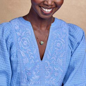 Rubies light up the three-wheel beads that slide freely along a fine 14kt gold chain. Lobster clasp. Handmade in USA. 16l.