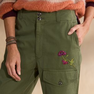 Overflowing with beautiful detail. our asymmetrical floral embroidered cargo pants feature a flattering Hollywood waist with two buttons. five pockets and a straight leg fit. Cotton/lycra. Machine wash. Imported. Exclusive. Sizes 0?C14. 25 inseam.