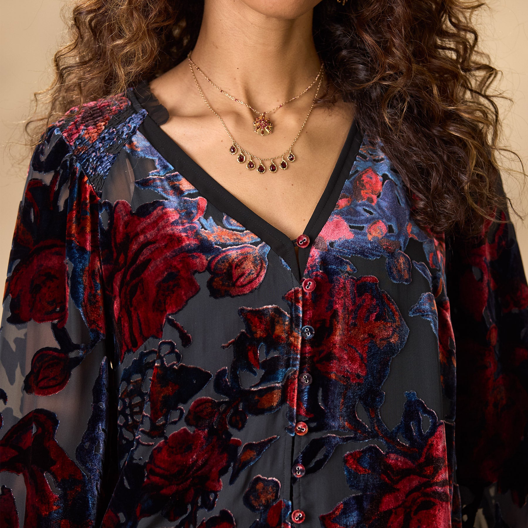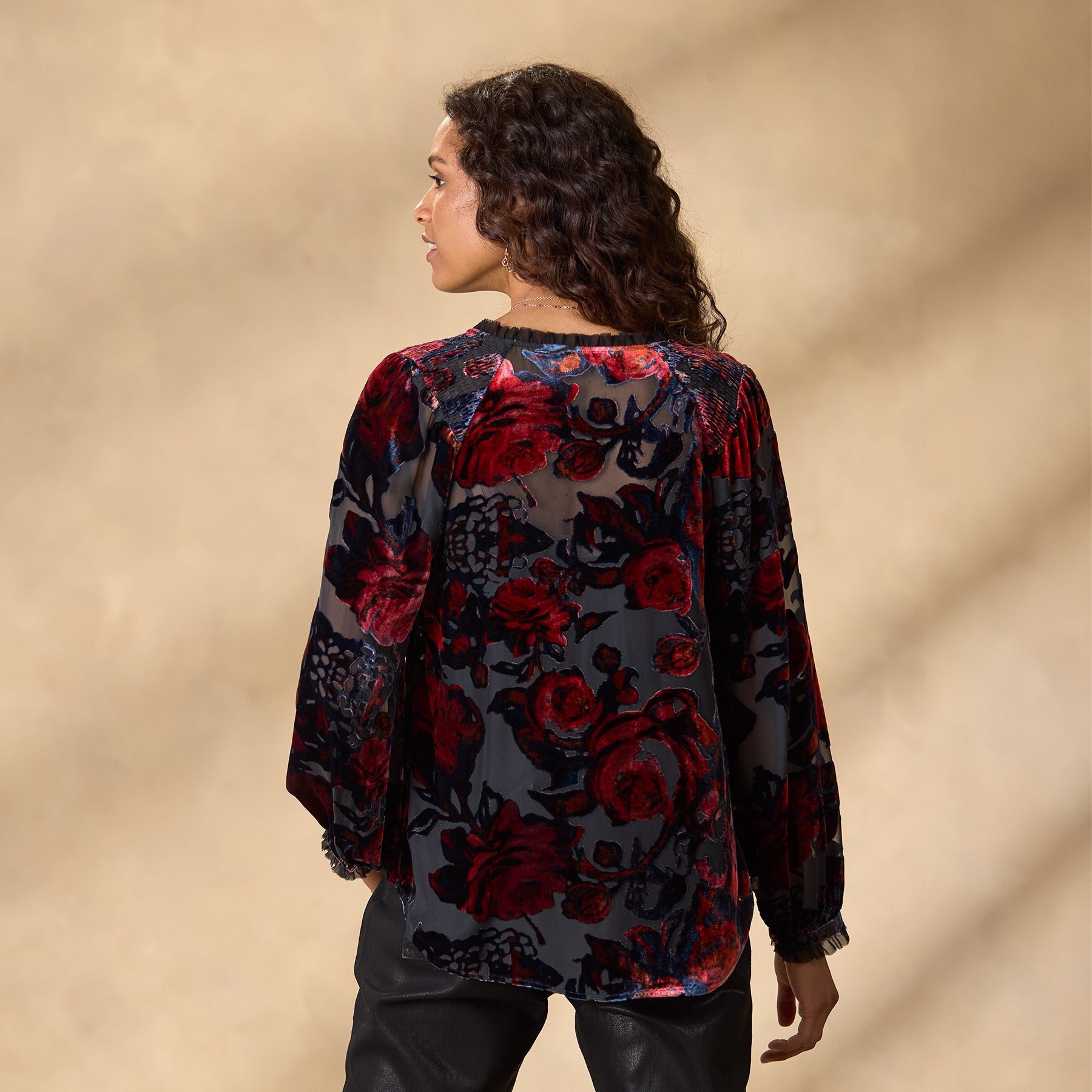Beautiful floral velvet burnout graces our easy and relaxed top with smocking at the shoulders. raw edge chiffon ruffles and a notch neckline. H-lo hem. Viscose/silk. Dry clean. Imported. Exclusive. Sizes XS (0–2). S (4–6). M (8–10). L (12–14). XL (16–18). XXL (20–22). Approx. 25l.