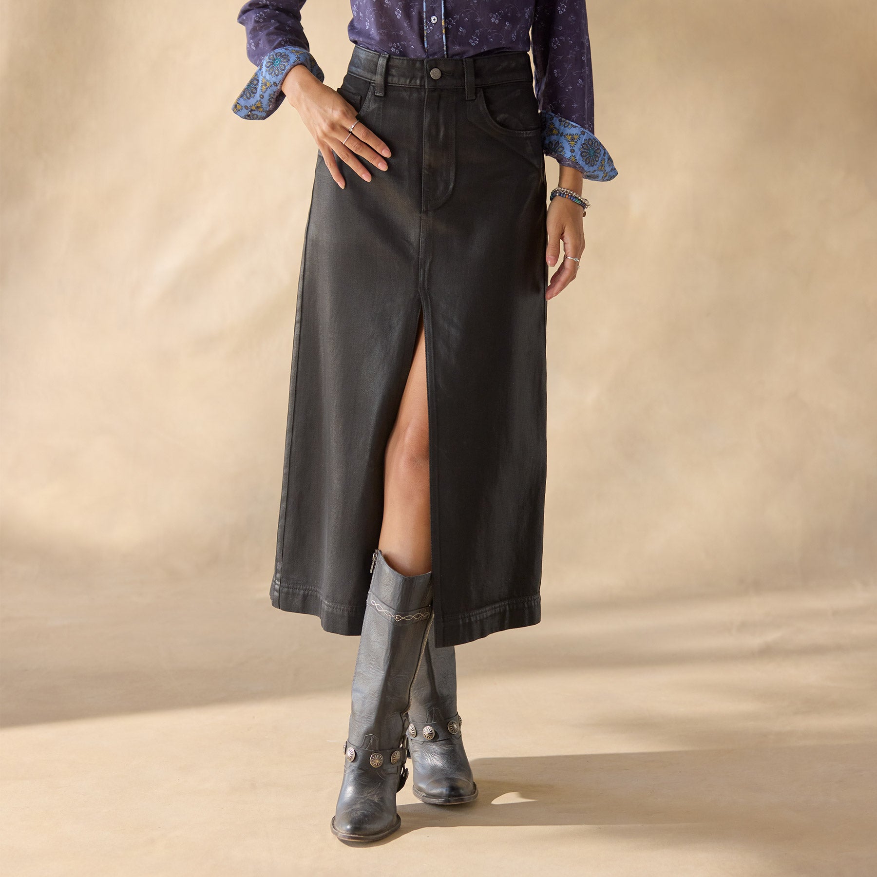Our stylish oh so easy to wear coated denim skirt takes a classic look and adds a special touch with five pockets. button and zip fly closure and a sophisticated center front slit. Cotton/lycra. Machine wash. Imported. Exclusive. Sizes 24?C32. Approx. 33.5l.