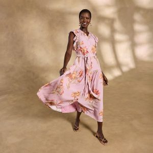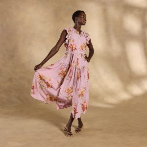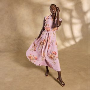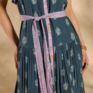 Effortlessly feminine. our Tierra tiered maxi is straight out of a rom-com montage—featuring a demure button front. ruffled neckline and sleeves plus a removable belt. Separate slip. Viscose/cotton. Machine wash. Imported. Exclusive. Sizes XXS (00). XS (0–2). S (4–6). M (8–10). L (12–14). XL (16–18). Approx. 49.5l.